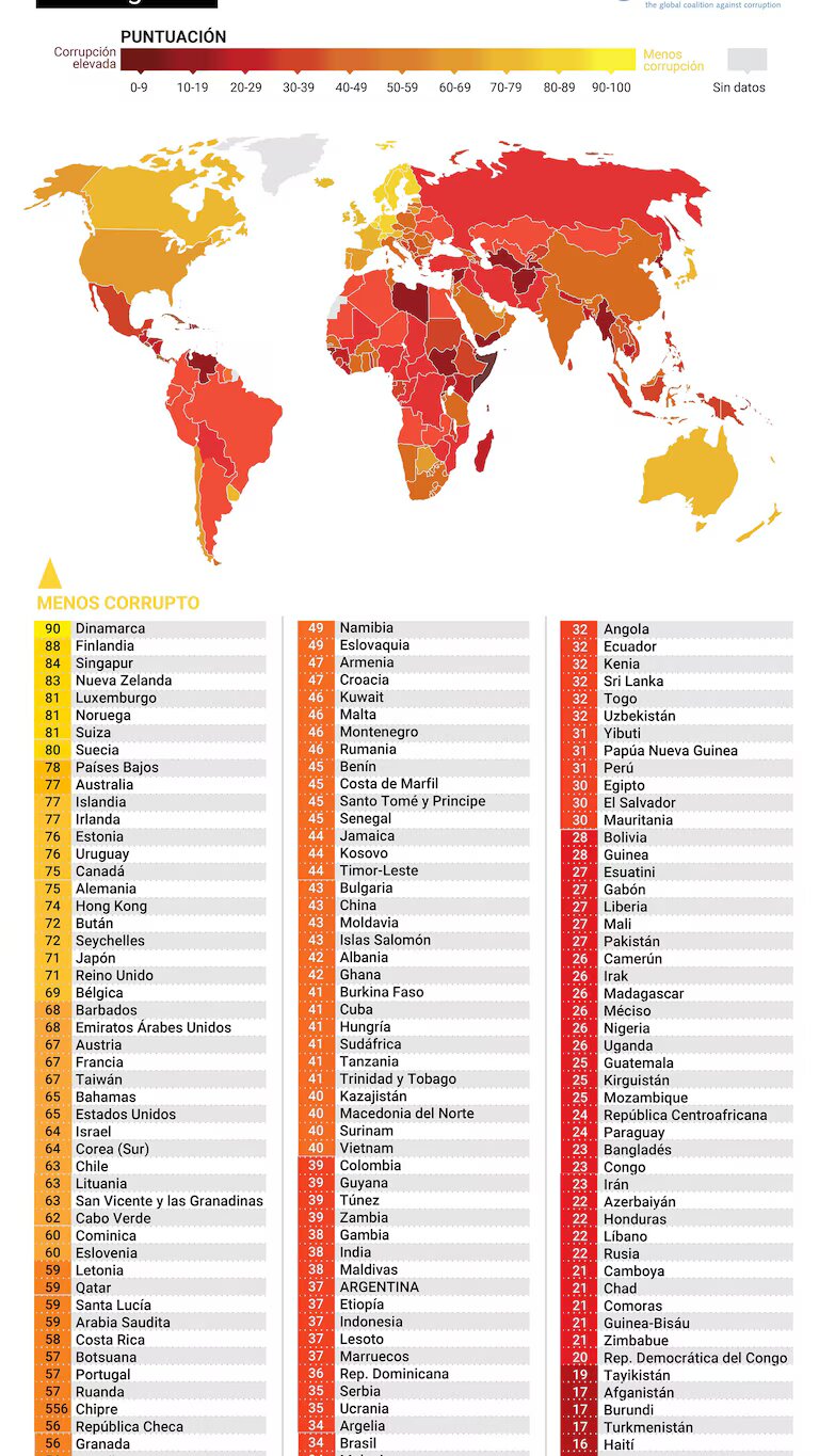 En el panorama global, Dinamarca se alza como la nación con la mejor calificación con 90 puntos, asegurando el primer lugar en el ranking. Finlandia obtiene el segundo puesto con 88 puntos, consolidándose también entre los países percibidos como menos corruptos, seguida por Singapur (84)