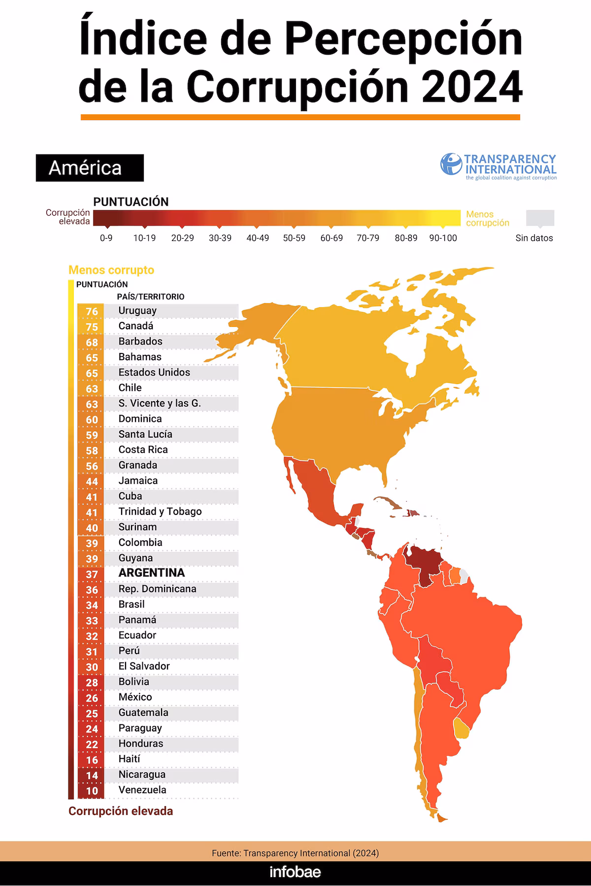 Obtuvo 37 puntos sobre 100 asignados al país más transparente, según la edición 2024 del Índice de Percepción de la Corrupción, que mide anualmente la ONG Transparencia Internacional. Es el mismo valor que se registró en 2023