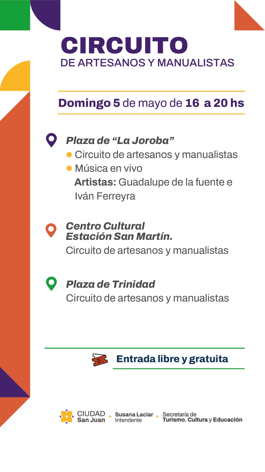 El domingo 5 de mayo, los sanjuaninos tendrán la oportunidad de disfrutar una tarde distinta en la Ciudad. Desde las 16:00 hasta las 20:00, tres puntos claves de la Ciudad se convertirán en espacios de creatividad y arte con el Circuito de Artesanos y Manualistas.