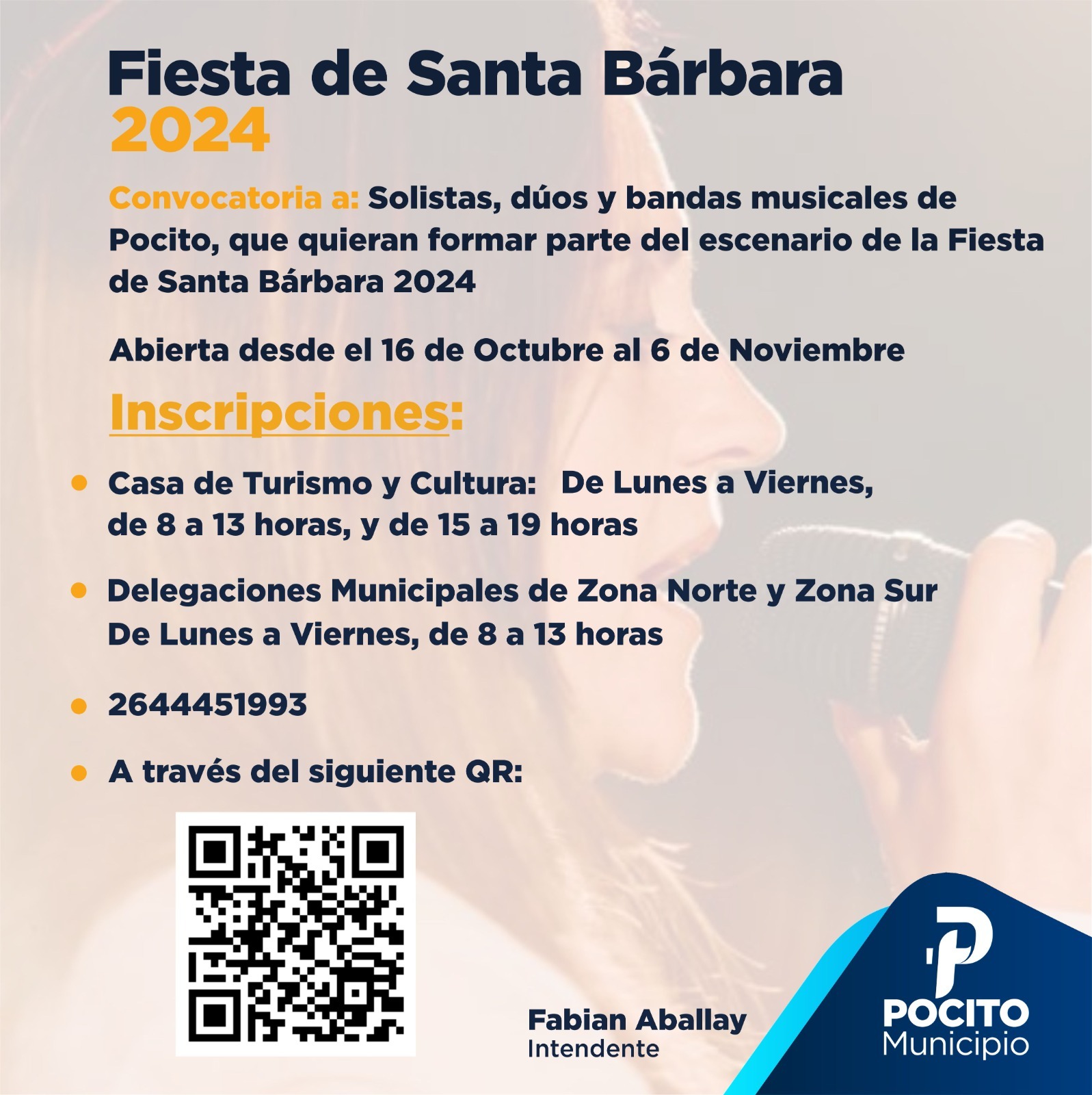 El Municipio de Pocito convoca a solistas, dúos y bandas del departamento para participar en el Pre Santa Bárbara 2024. Los ganadores formarán parte de las grilla de artistas que se presentarán en el escenario de la principal fiesta departamental que se realizará en diciembre.