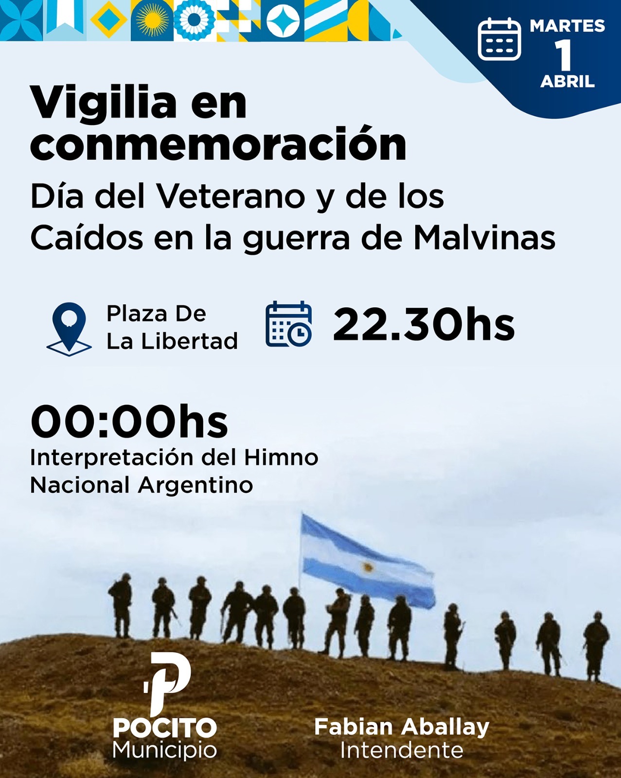 La Municipalidad de Pocito conmemorará un nuevo aniversario de la Guerra de Malvinas con una vigilia que se realizará este martes 1 de abril a partir de las 22.30 horas en la Plaza De La Libertad.