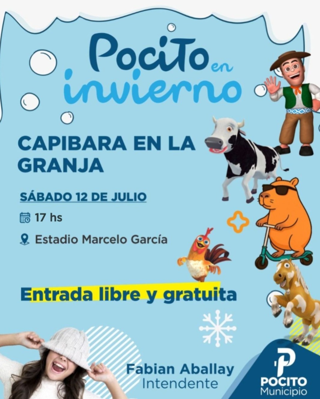 La Municipalidad de Pocito te invita a disfrutar "Capibara en La Granja", esta sábado 12 de julio a las 17 horas en el Estadio Marcelo García.