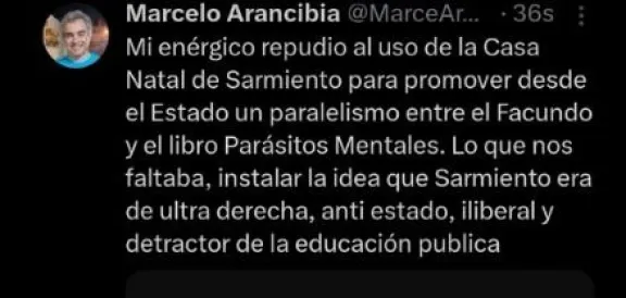 En sus redes sociales, Arancibia expresó: “Mi enérgico repudio al uso de la Casa Natal de Sarmiento para promover desde el Estado un paralelismo entre el Facundo y el libro Parásitos Mentales. Lo que nos faltaba, instalar la idea que Sarmiento era de ultraderecha, antiestado, iliberal y detractor de la educación pública”.