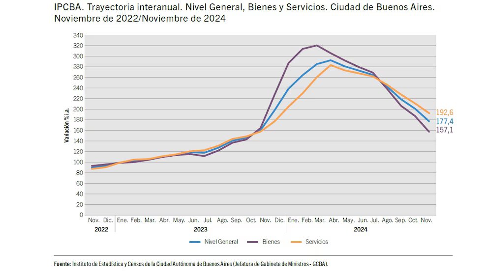 “Lo mejor del dato de CABA es que bajó la núcleo respecto del mes previo. Lo peor es la divergencia entre bienes y servicios que sigue siendo fuerte hace ya casi 12 meses del sinceramiento cambiario de diciembre de 2023″, opinó el economista de Outlier, Gabriel Caamaño.