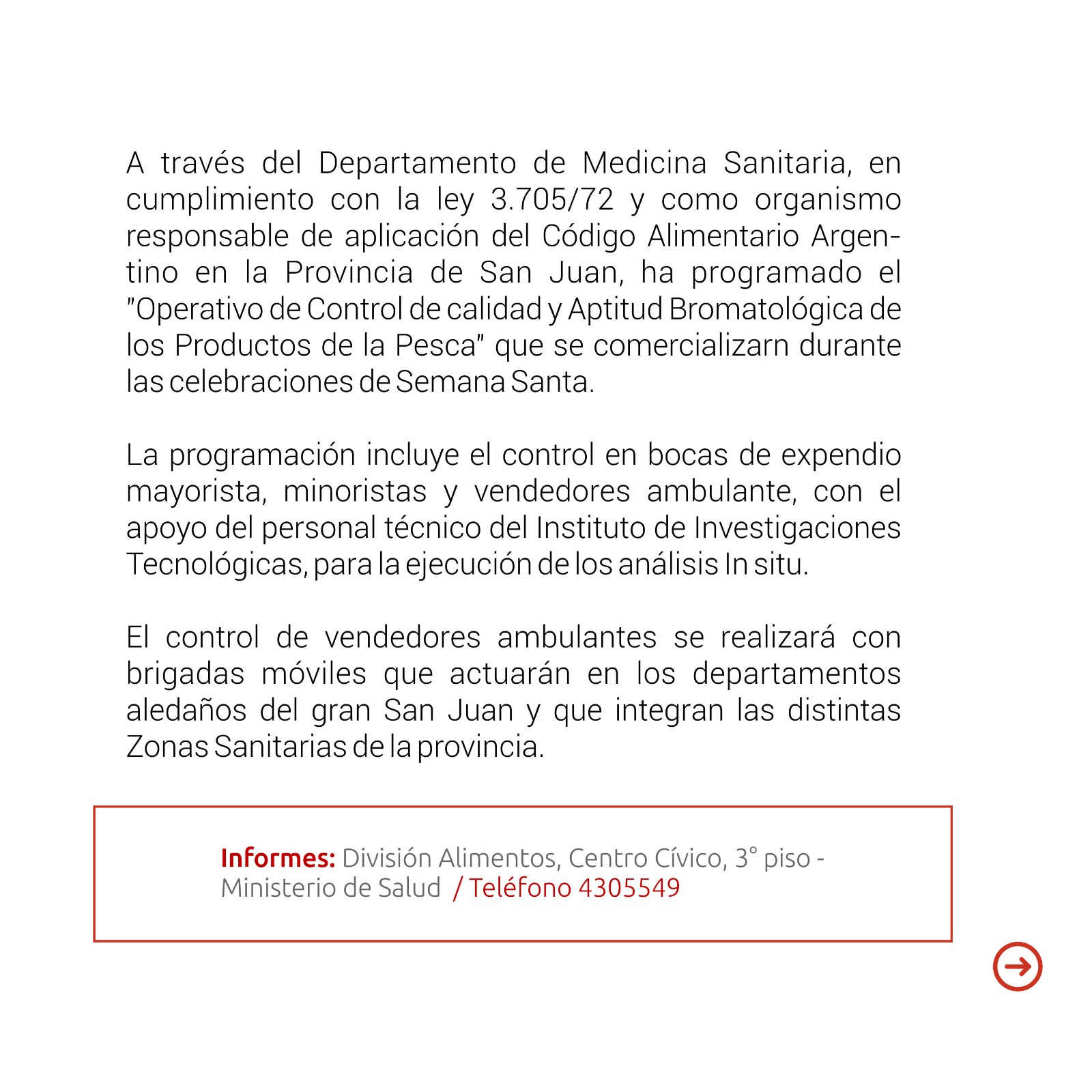 El Departamento Medicina Sanitaria, del Ministerio de Salud llevará adelante controles en cumplimiento con la Ley 3705/72 y como organismo responsable de aplicación del Código Alimentario Argentino en la Provincia de San Juan.
