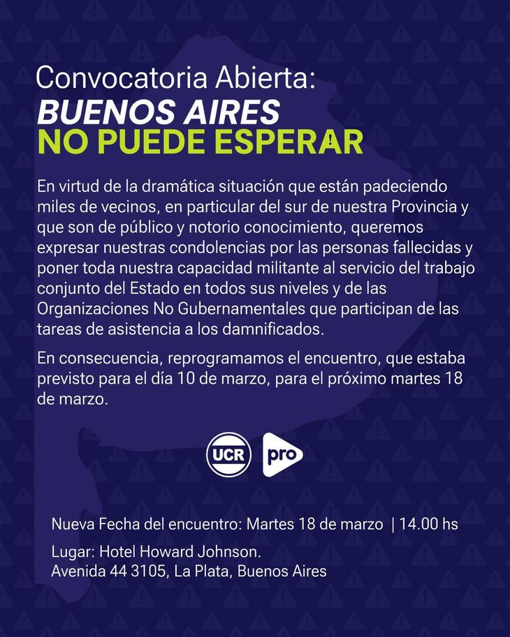 A partir del temporal en Bahía Blanca, ambos partidos pospusieron una semana el encuentro donde iban a relanzar un frente electoral sin La Libertad Avanza para enfrentar a Axel Kicillof en Buenos Aires.