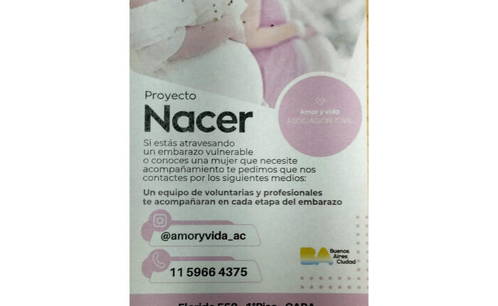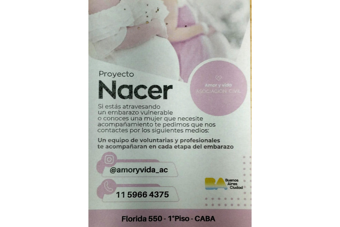 “Si estás atravesando un embarazo vulnerable o conocés a una mujer que necesite acompañamiento te pedimos que nos contactes por los siguientes medios”, dice el folleto de la Asociación Civil Amor y Vida, con el título de “Proyecto Nacer” y el logo del gobierno porteño, que se entrega en el puesto del CESAC 26. A continuación figura el instagram, un celular y la dirección de la organización.