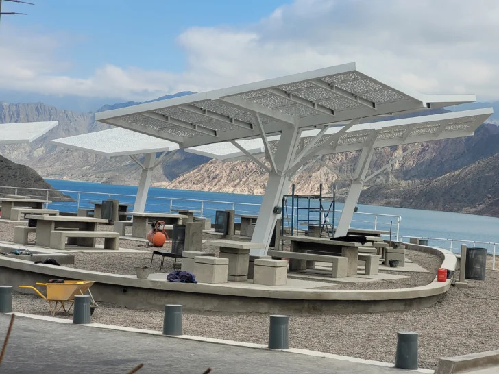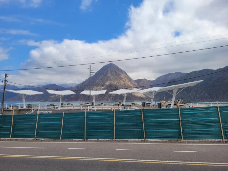 Ubicado sobre la Ruta Provincial Nº 12, el nuevo parador ya deja ver su estructura con techos inclinados, mesas, asientos, barandas de seguridad y columnas para carga solar. Aunque aún permanece cerrado al público, con una lona verde y alambrado perimetral, desde afuera ya se percibe el cambio en el entorno.
