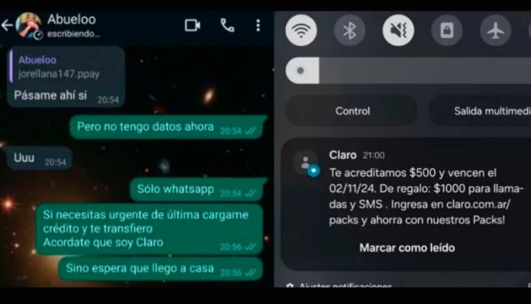 En la conversación, el supuesto abuelo le pedía dinero a su nieto: “Necesito si podés prestarme 40 mil pesos”. Ante esta petición, el joven respondió con sagacidad: “Si necesitas urgente de última cargame crédito y te transfiero. Acordate de que soy Claro. Si no, esperá que llego a casa”.