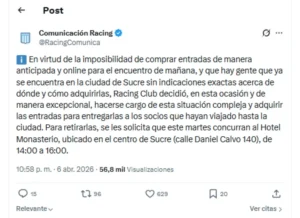 “En virtud de la imposibilidad de comprar entradas de manera anticipada y online para el encuentro de mañana, y que hay gente que ya se encuentra en la ciudad de Sucre sin indicaciones exactas acerca de dónde y cómo adquirirlas, Racing Club decidió, en esta ocasión y de manera excepcional, hacerse cargo de esta situación compleja y adquirir las entradas para entregarlas a los socios que hayan viajado hasta la ciudad”, informó el club en un comunicado.