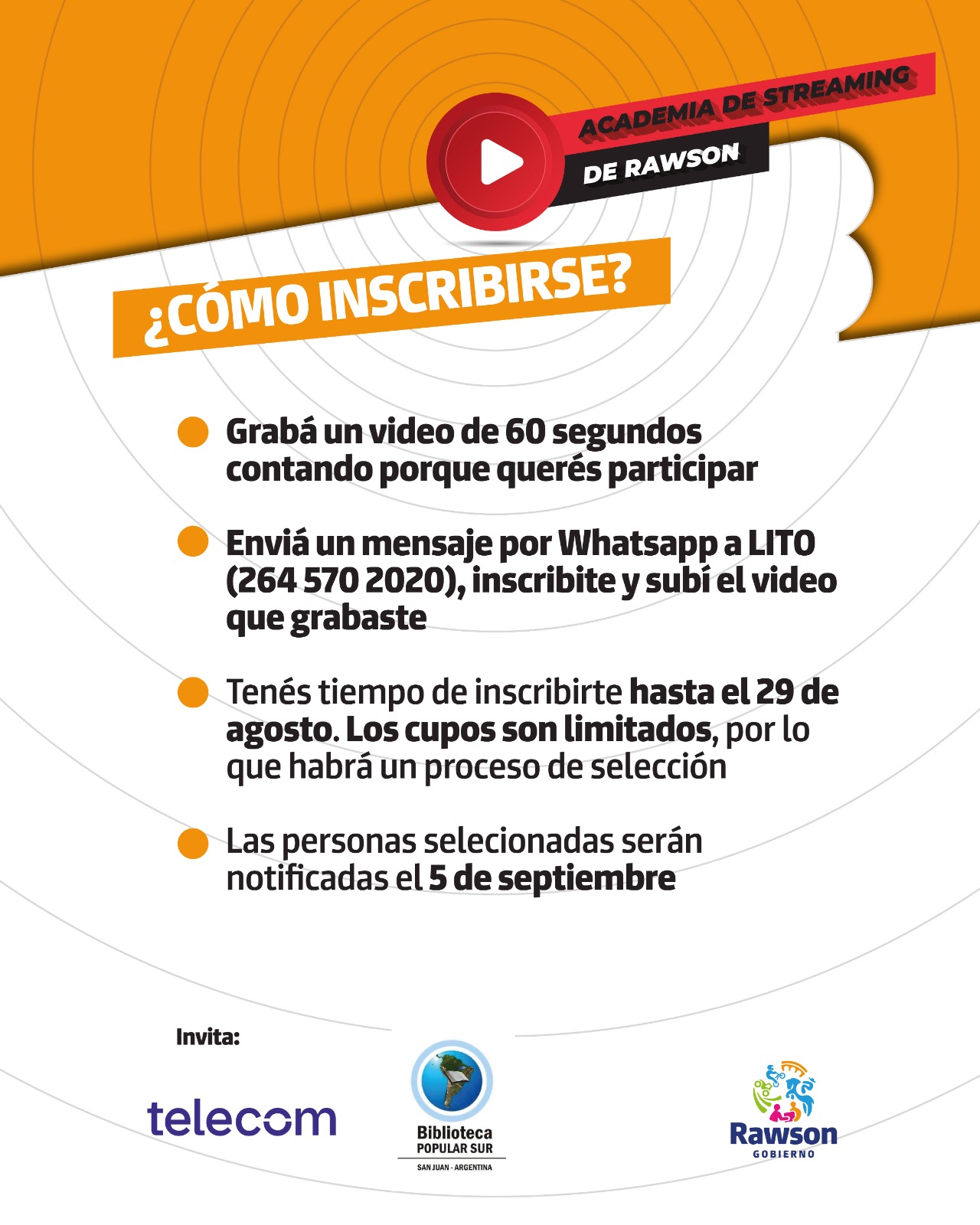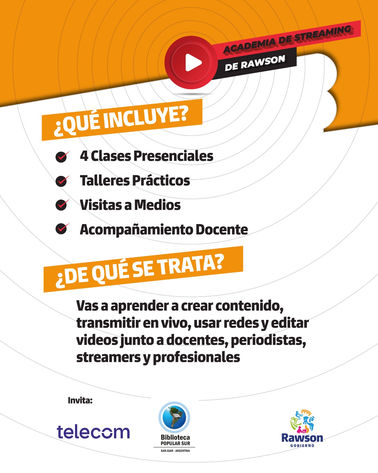 El próximo 3 de septiembre se pondrá en marcha en Rawson la primera Academia de Streaming, un espacio de formación gratuita impulsado por la Municipalidad de la Ciudad de Rawson en conjunto con TELECOM. La iniciativa está destinada a jóvenes y emprendedores del departamento, con el propósito de brindar herramientas que fortalezcan la creatividad, la tecnología y las nuevas estrategias de comunicación digital.