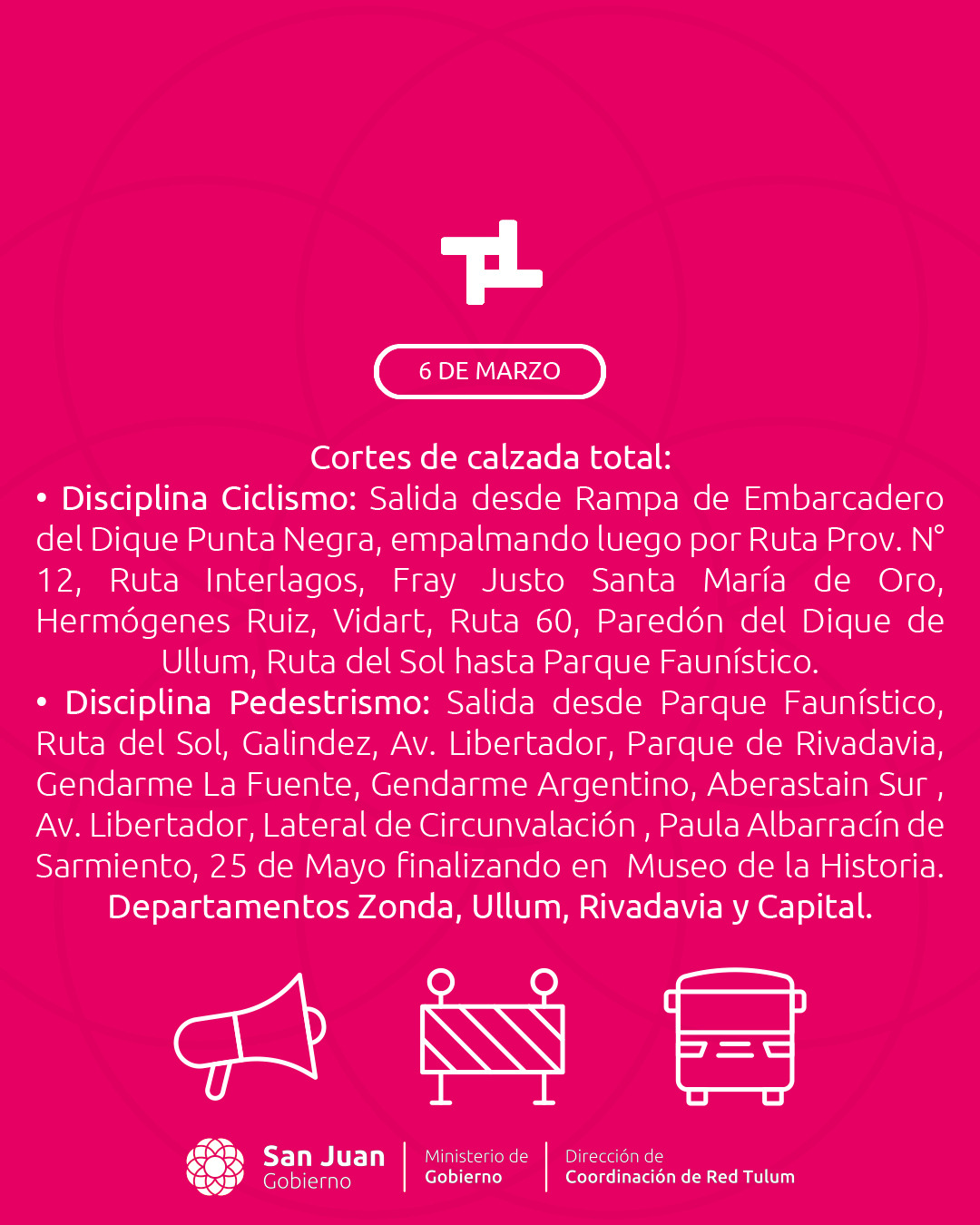 Con motivo de la realización del Triatlón del Sol 2025, el próximo domingo 9 de marzo, entre las 6:00 y las 14:00, diversas líneas del transporte público sufrirán modificaciones en sus recorridos habituales. La competencia, que abarcará los departamentos de Zonda, Ullum, Rivadavia y Capital, demandará desvíos estratégicos para garantizar la circulación y seguridad de los participantes y usuarios del servicio de colectivos explicó el Ministerio de Gobierno a través de la Dirección de Coordinación de RedTulum.