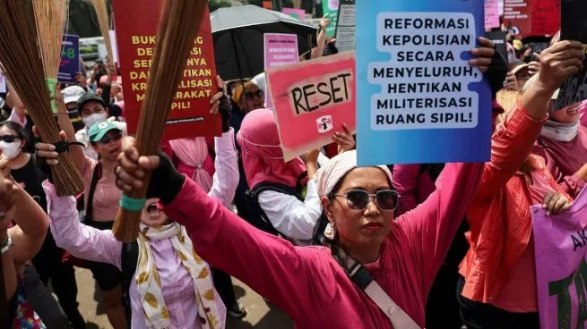 Cientos de mujeres indonesias, se unieron este miércoles a las protestas en Yakarta contra los privilegios de los políticos y la brutalidad policial, mientras el presidente, Prabowo Subianto, volaba a China para asistir a un desfile militar.