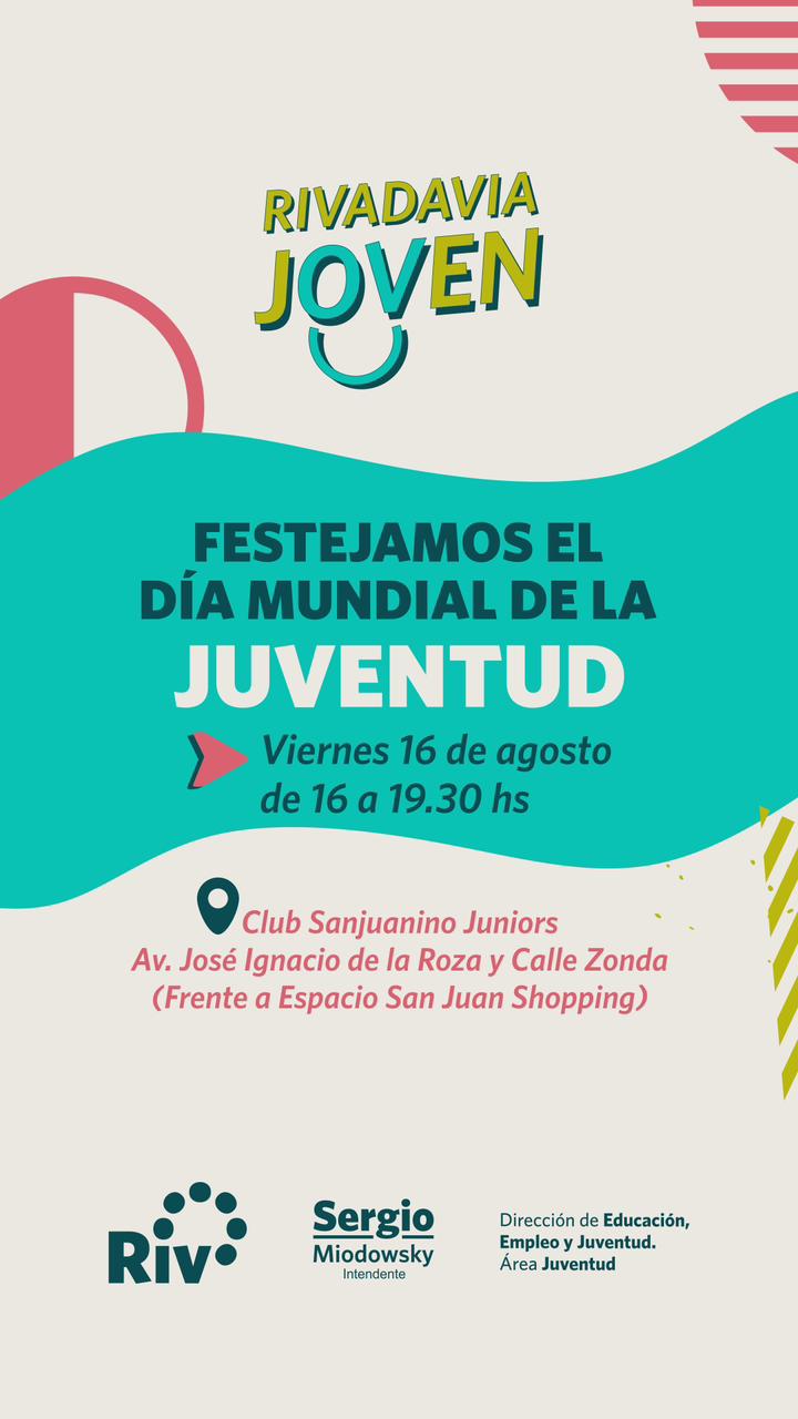La Municipalidad de Rivadavia a través de su Área de Juventud, organiza una gran fiesta para los jóvenes este viernes 16 de agosto de 16 a 19:30 horas en el Club Sanjuanino Junior, ubicado en Av. José Ignacio de la Roza y Calle Zonda, frente a Espacio San Juan Shopping.