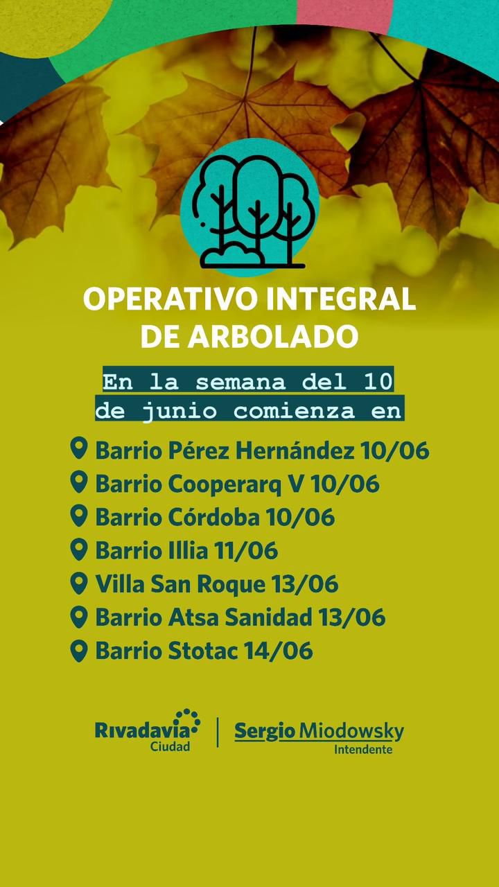 La Municipalidad de Rivadavia sigue adelante con su calendario de intervención de arbolado público, entrando en la quinta semana del Operativo Integral de Arbolado. Del 10 al 15 de junio, los equipos especializados trabajarán en siete barrios clave del departamento.