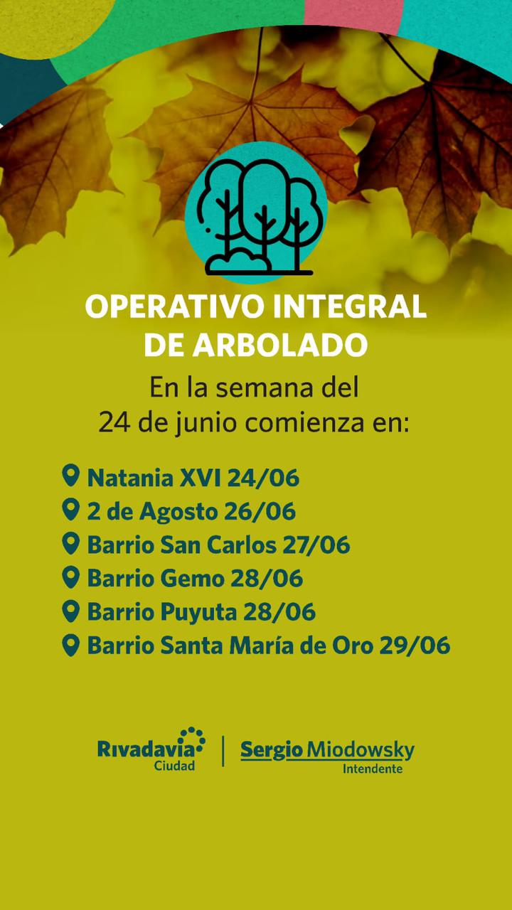 La Municipalidad de Rivadavia continúa con su calendario de intervención de especies arbóreas en la semana del 24 al 29 de junio en cuatro barrios de diferentes comunas.