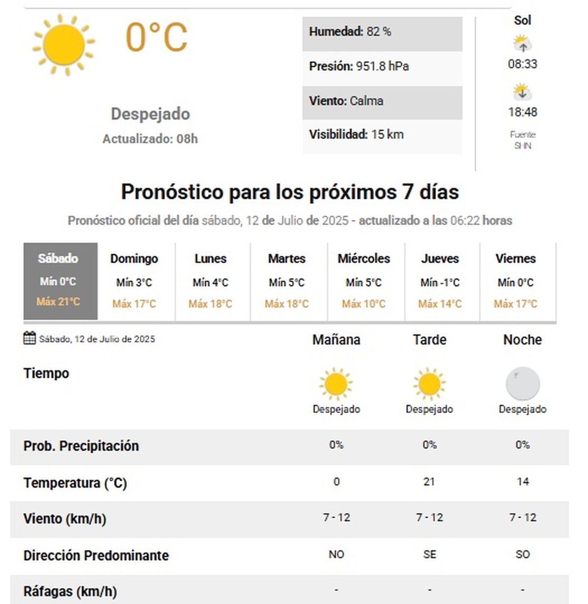 Mientras que para el domingo, se espera una mínima de 3°C y una máxima de 17°C, cielo despejado y leve brisa que variará desde el noreste y sureste durante todo el día.