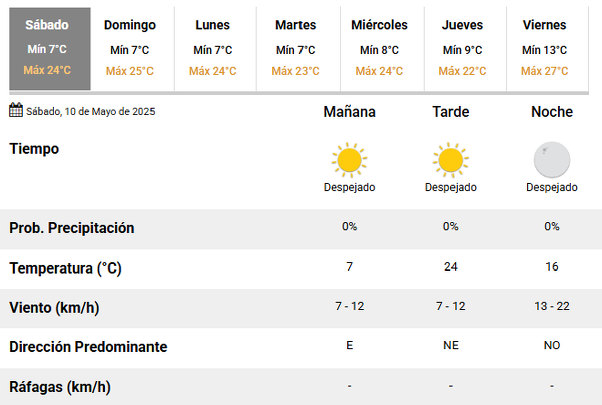 Para este sábado, el Servicio Meteorológico Nacional (S.M.N.) anunció que se espera una importante amplitud térmica entre la mañana y la tarde. De acuerdo al pronóstico del tiempo emitido a las 6, la temperatura mínima será de 7 grados (en el registro de las 8 se llegó a 6 grados) y la máxima alcanzará los 24 grados. Todo esto será bajo un cielo despejado.