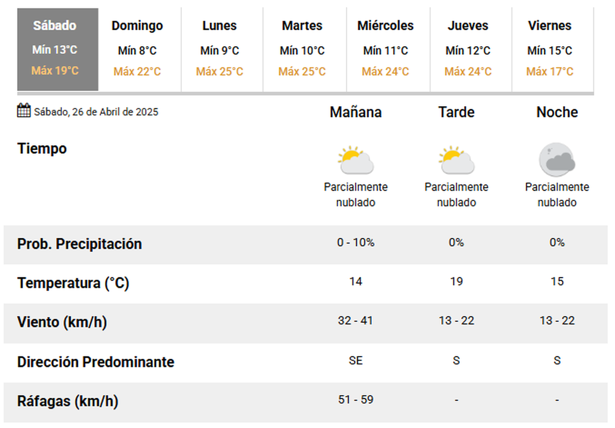 Según el reporte, para este sábado se espera que la temperatura oscile entre 13 y 19 grados, bajo un cielo parcialmente nublado. Durante la mañana habrá ráfagas de viento sur, que podrían alcanzar los casi 60 km/h.