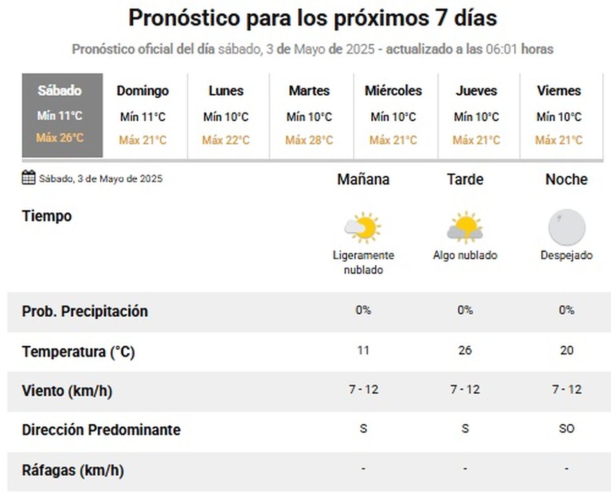 El sábado arrancó con leve brisa del norte y cielo despejado. Según el Servicio Meteorológico Nacional, se espera una temperatura máxima de 26°C.