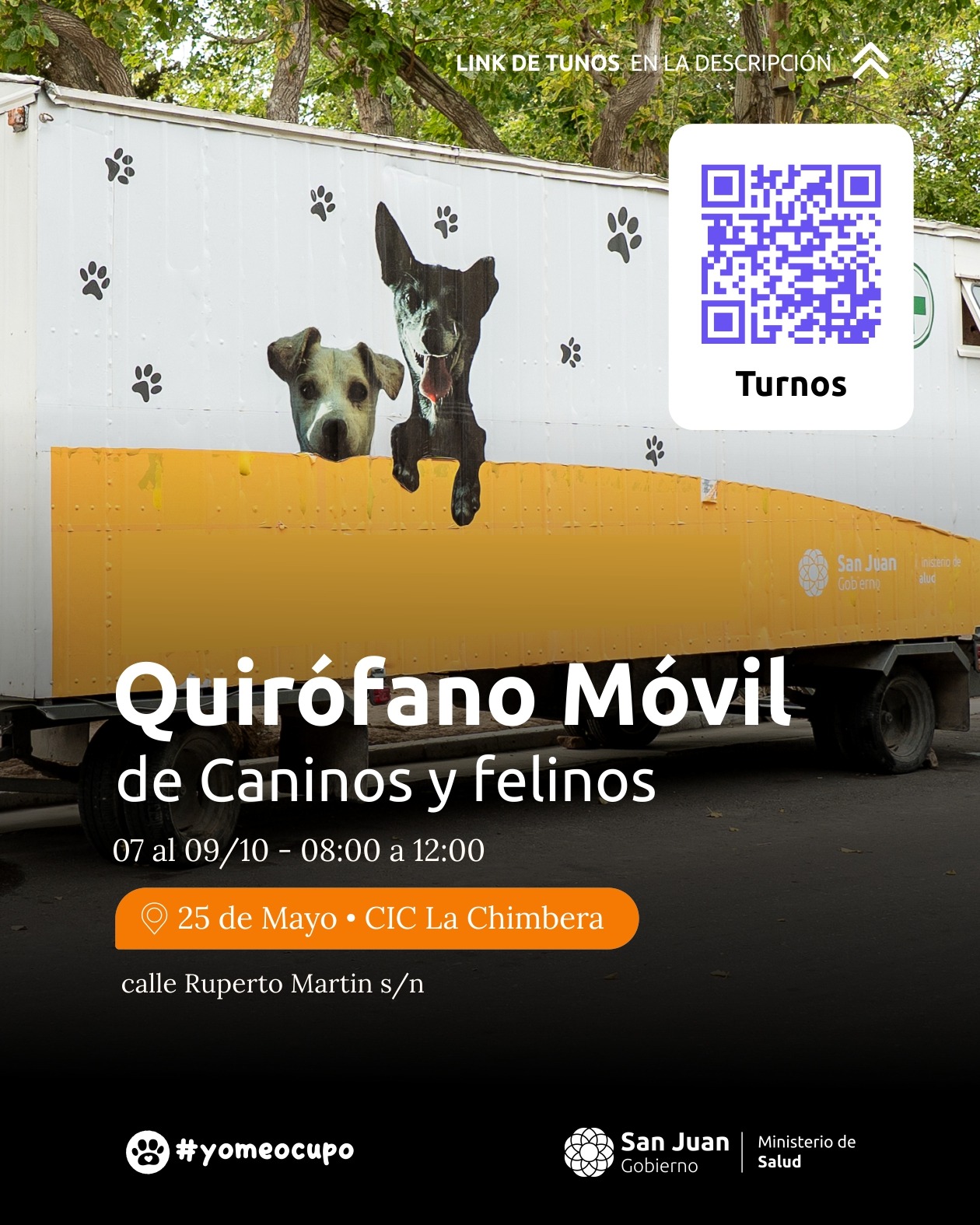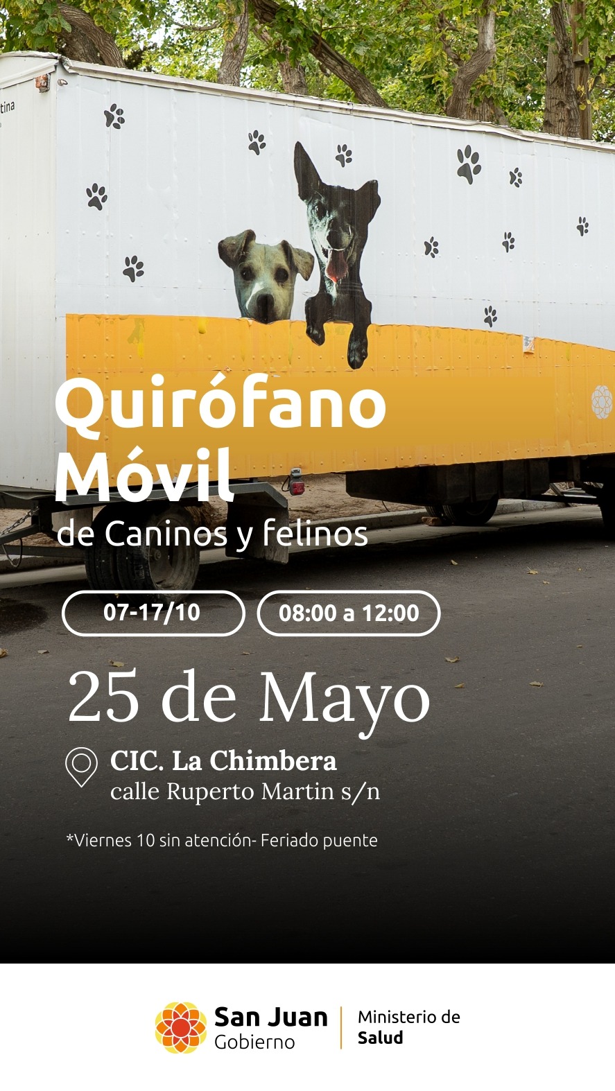 El Ministerio de Salud informa, a través de la División de Epidemiología – Sección Zoonosis, que desde el martes 7 hasta el viernes 17 de octubre, el Quirófano Móvil de Mascotas se instalará en la localidad de La Chimbera, departamento 25 de Mayo.