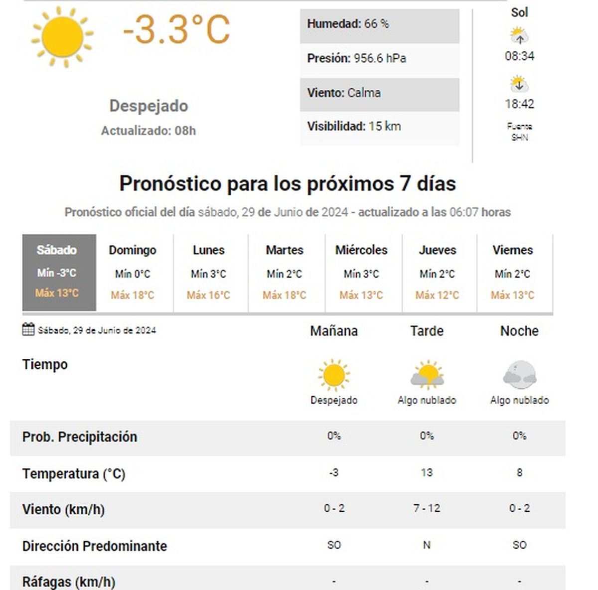 El sábado amaneció helado en San Juan. La mínima que registró el Servicio Meteorológico Nacional fue de -3.3°C, con cielo despejado y viento en calma.
