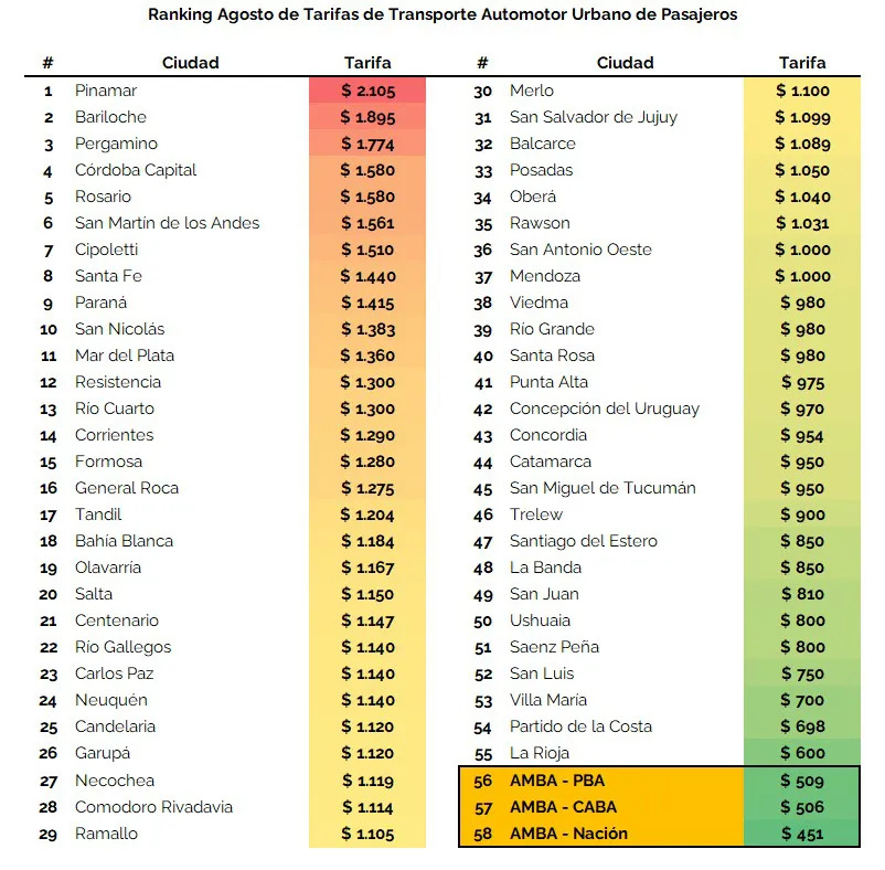 Este valor es significativamente inferior al promedio nacional y muy por debajo de localidades como Pinamar, que encabeza el ranking con un pasaje de $2.105, o Bariloche y Pergamino, donde el boleto cuesta $1.895 y $1.774 respectivamente.