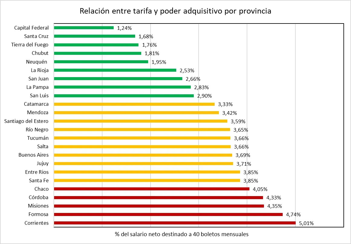 En contraste, Corrientes es la provincia donde el transporte urbano tiene un mayor peso sobre el salario promedio, alcanzando un 5,01 %. Le siguen Formosa (4,74 %), Misiones (4,35 %), Córdoba (4,33 %) y Chaco (4,05 %). El estudio destaca que en 11 provincias el impacto económico supera el 3,6 %.