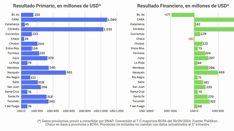 Según un informe de la consultora Politikón Chaco, que relevó datos hasta el tercer trimestre de 2024 para 20 de las 24 provincias, la mayoría logró mantener su equilibrio fiscal con un superávit primario de casi 1% del PBI, a pesar de una caída en los ingresos provinciales del 15,4%. Este ajuste fue clave para alcanzar un superávit financiero consolidado de USD 4.474 millones.