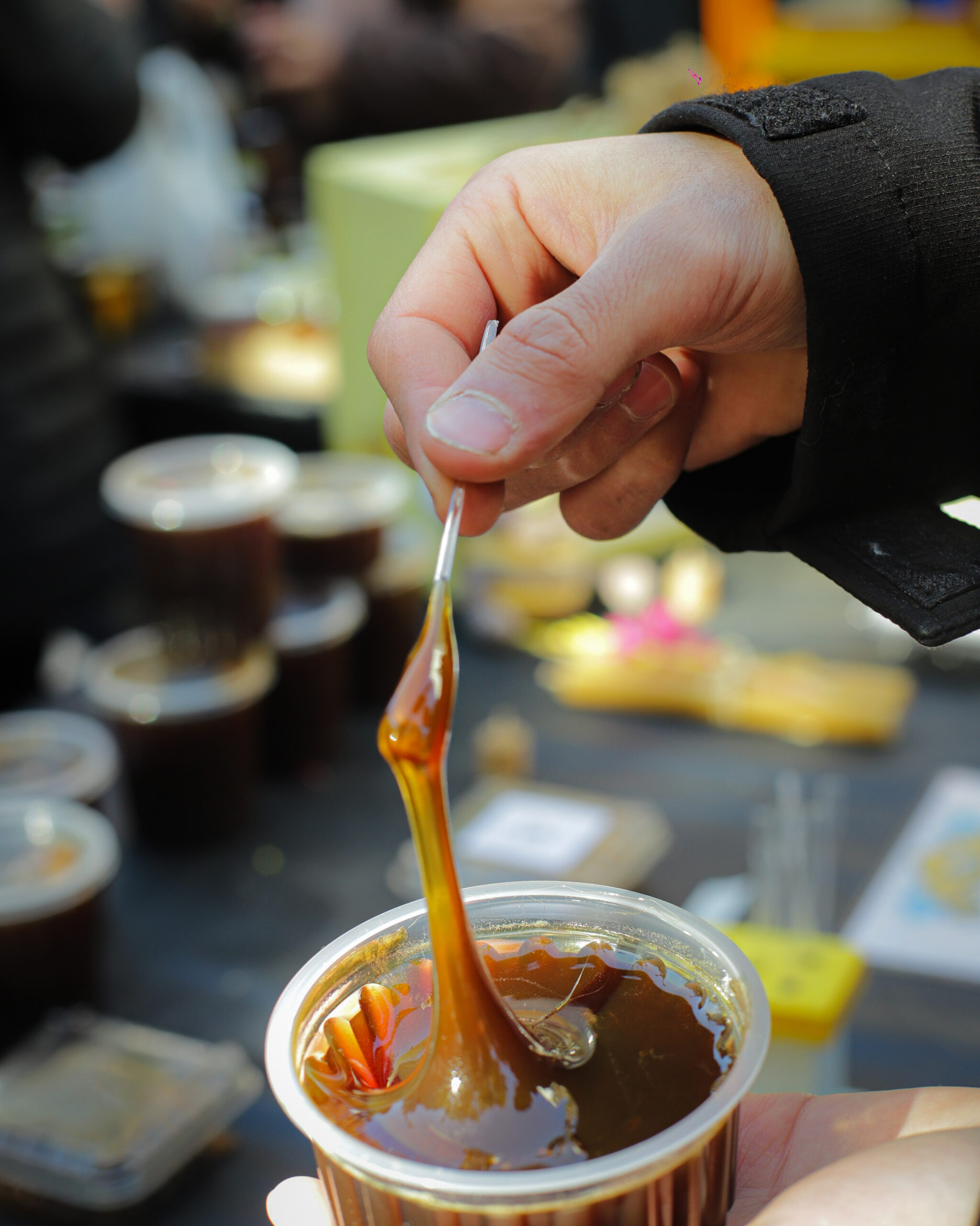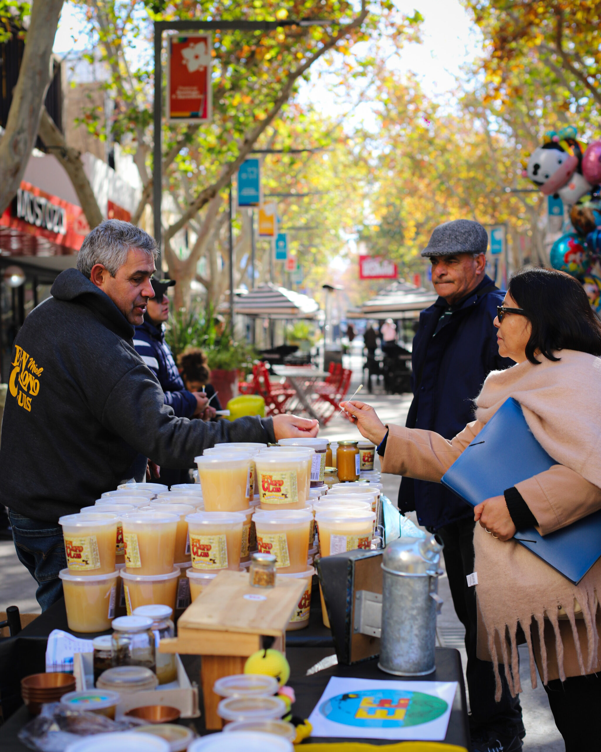 El Cruce de Peatonales fue un paraíso de los amantes de la miel y los productos naturales. En tanto hoy habrá exhibición y venta en el hall del Centro Cívico. Productores locales y escuelas agrotécnicas muestran lo mejor de sus cosechas: mieles, propóleos, jaleas reales y más.