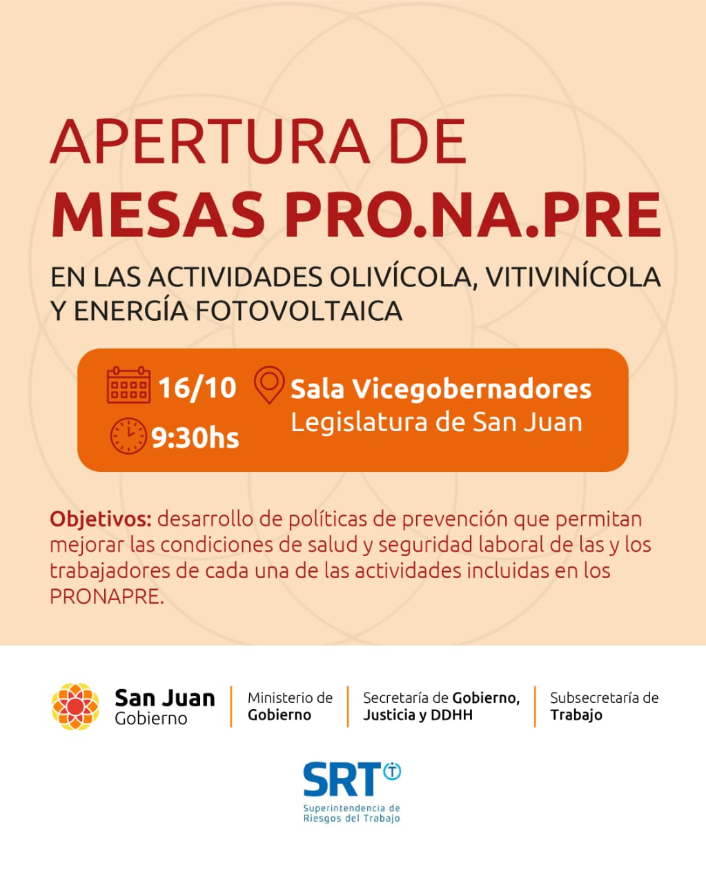 El Ministerio de Gobierno de San Juan, a través de la Secretaría de Gobierno, Justicia y Derechos Humanos y la Subsecretaría de Trabajo, llevará adelante la implementación del Programa Nacional de Prevención (Pro.Na.Pre) de la Superintendencia de Riesgos de Trabajo (SRT).