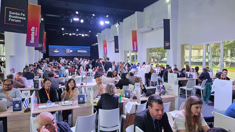 Las charlas, en el complejo La Fluvial Rosario, en la zona portuaria de esta ciudad, pegado al Paraná, son vibrantes y cosmopolitas. Se nota el entusiasmo: la idea es cerrar negocios y funciona. Cada una de las más de 100 mesas tiene banderas de más de 80 países que vinieron a Argentina a ser parte de esta ronda comercial inversa: en lugar de viajar a un país o continente a “vender” la provincia, Santa Fe trajo a Argentina a más de 250 compradores de 45 países para mostrarles los productos regionales y cerrar acuerdos comerciales. A ellos se suman más de 1.000 empresas argentinas vendedoras y 30 fondos de inversión, distribuidos en espacios que buscan activar negocios y diálogo entre distintos sectores.