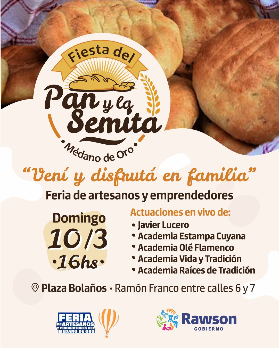 Los interesados en participar en el concurso de la Fiesta del Pan y la Semita Rawsina. Pueden inscribirse a través de los siguientes números telefónicos 264-4774168 o 264-4995025. También pueden hacerlo en el Centro Integrador Comunitario (CIC) de Médano de Oro, ubicado en la calle Ramón Franco entre 6 y 7, frente a Plaza Bolaños.