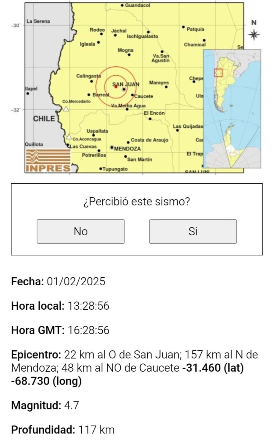 San Juan volvió a sentir el movimiento de la tierra este sábado 1 de febrero, cuando un sismo de magnitud 4.7 se registró a las 13:28 horas. Según los datos preliminares del Instituto Nacional de Prevención Sísmica (INPRES), el epicentro se ubicó a 22 kilómetros al oeste de la capital sanjuanina, a una profundidad de 117 kilómetros.