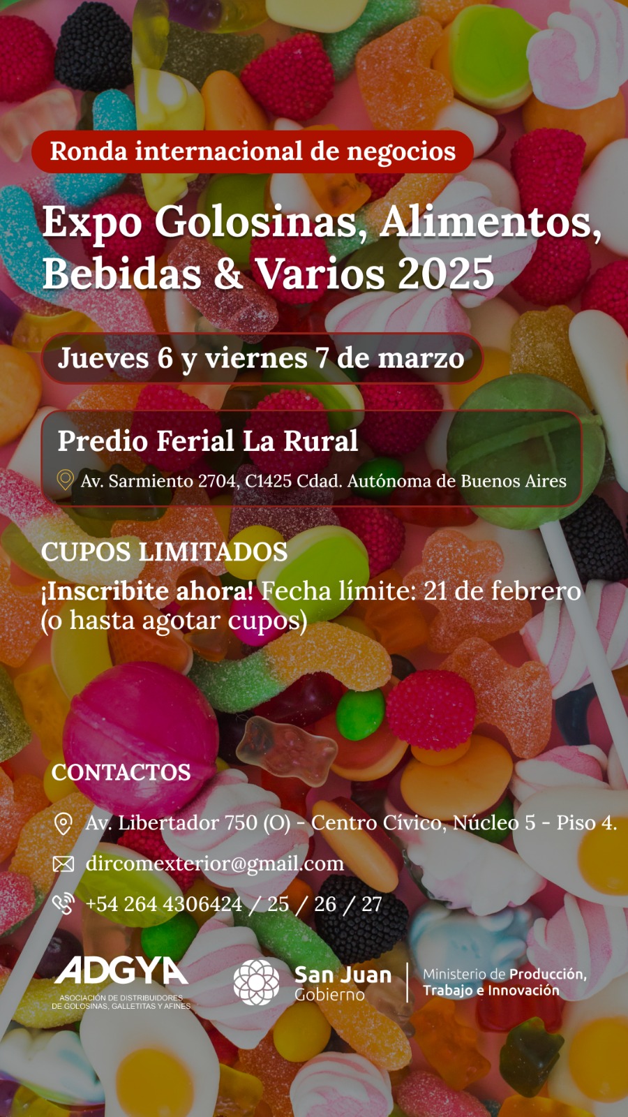 La Dirección de Comercio Exterior de San Juan invita a participar en la Ronda de Negocios Internacional Expo Golosinas, Alimentos, Bebidas y Varios 2025