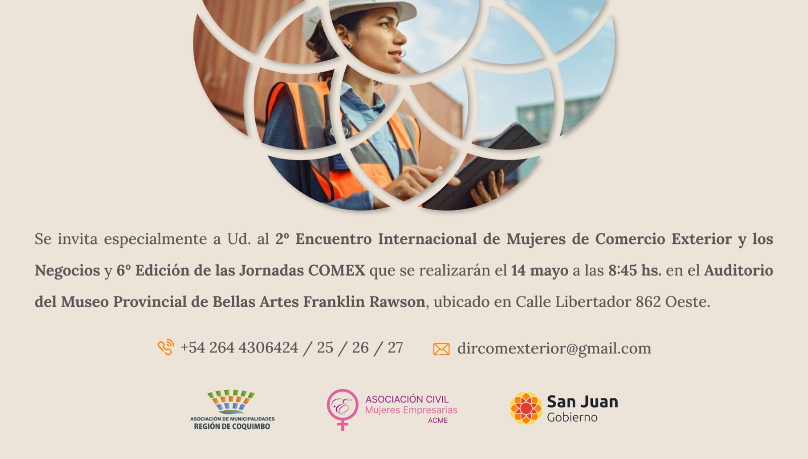 Valorar la presencia de las mujeres como motor de empresas y generadora de nuevos vínculos para fortalecer las exportaciones, es uno de los objetivos de esta jornada. Por eso, el Ministerio de Producción, Trabajo e Innovación a través de la Dirección de Comercio Exterior, las Agencias San Juan Inversiones y Calidad San Juan, y Ministerio de Gobierno mediante la Secretaría de Relaciones Institucionales, junto la Asociación de Mujeres Empresarias de ACME y la Asociación de Municipalidades de Coquimbo invitan a participar del 2º Encuentro Internacional de Mujeres de Comercio Exterior y los negocios.