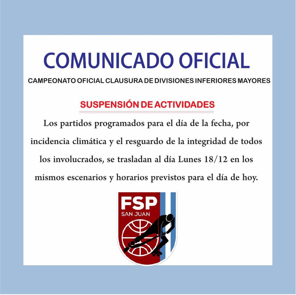 “Los partidos programados para el día de la fecha, por incidencia climática y resguardo de la integridad de todos los involucrados, se trasladan al lunes 18/12 en los mismos escenarios y horarios previstos para el día de hoy”, comunicó la FSP.