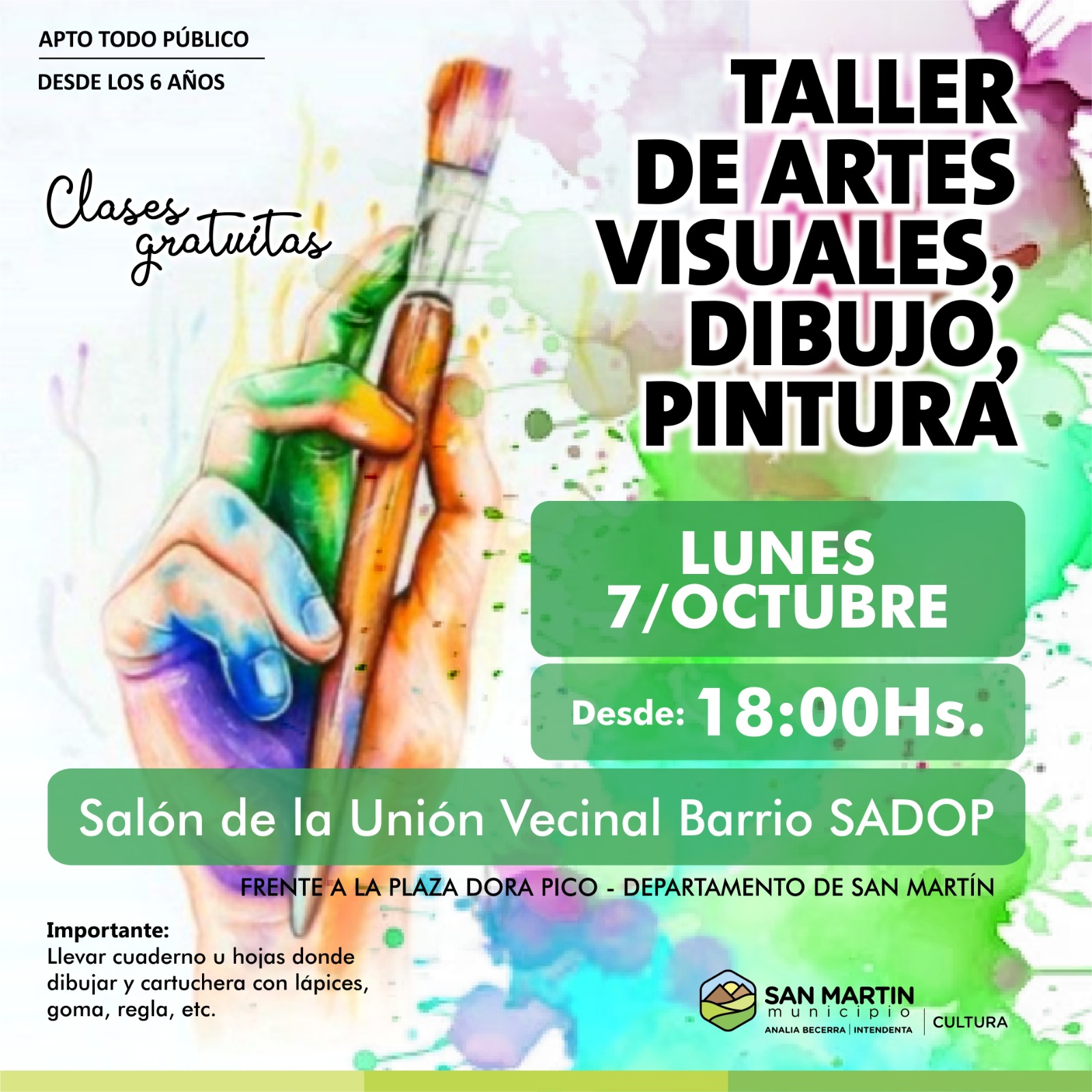 El Municipio de San Martín, a través del área de Cultura, invita a niños y niñas a partir de los 6 años a participar de un taller gratuito de Artes Visuales. La actividad se llevará a cabo el lunes 7 de octubre a partir de las 18:00 horas en el Salón de la Unión Vecinal Barrio SADOP, ubicado frente a la Plaza Dora Pico.