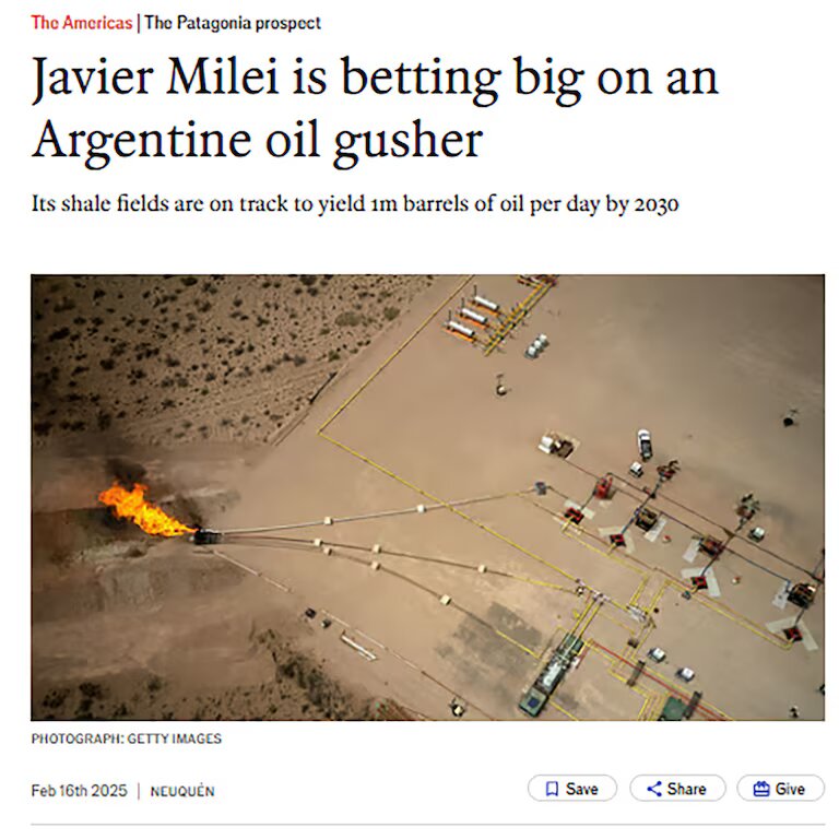 En 2024 la Argentina exportó más energía de la que importó por primera vez en 14 años, este año superará a Colombia para posicionarse como el tercer productor de petróleo de América Latina, con unos 800.000 barriles diarios, sólo detrás de los 3 millones de Brasil y del millón de Venezuela, y solo China tiene más reservas de gas, destacó The Economist en un extenso artículo publicado este sábado, tras una visita a Neuquén.