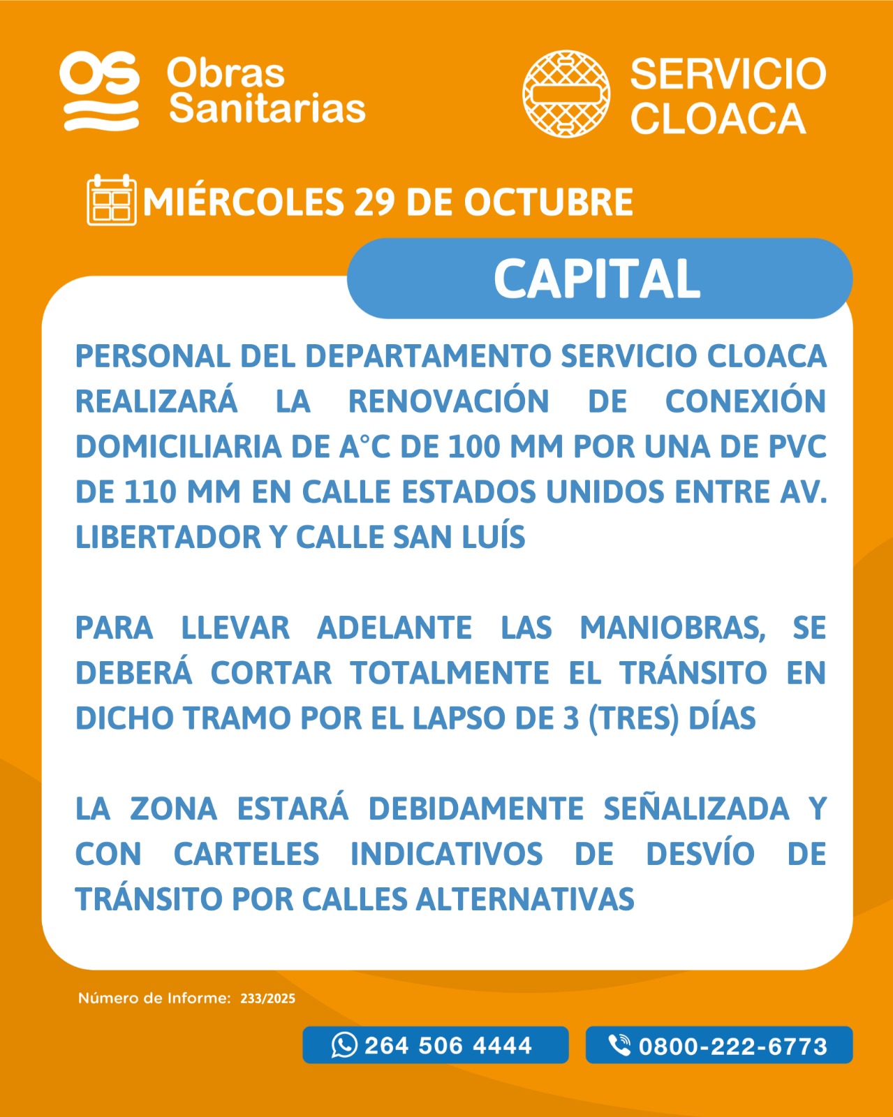 La Municipalidad de la Ciudad de San Juan informó que este miércoles 29 de octubre se llevarán a cabo trabajos de renovación de conexión domiciliaria en calle Estados Unidos, en el tramo comprendido entre Avenida Libertador y calle San Luis.