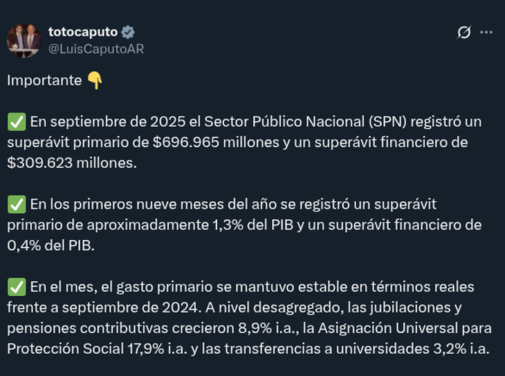 “El superávit financiero de $309.623 millones contrasta con el resultado de septiembre de 2023, donde se había registrado un déficit de $511.533 millones, equivalente a casi $2.100.000 millones ajustados por inflación”, indicó Caputo quien al respecto dijo que “frente a los intentos de parte del arco político de romper el equilibrio fiscal, el Gobierno continuará garantizando el orden en las cuentas públicas, ya que es condición necesaria para continuar mejorando la calidad de vida de los argentinos”.