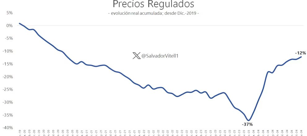 La desaceleración de la inflación coincidió con que los precios relativos con Milei se encuentran prácticamente en los niveles en los que los había dejado Mauricio Macri, en menos de un año de mandato. El head of research de Romano Group, Salvador Vitelli, destacó que el rubro regulados – tarifas de servicios públicos y combustibles sobre los que el Gobierno tiene incidencia – en diciembre de 2023 estaban en diciembre 37% “atrasados” respecto de los de diciembre de 2019 y en noviembre de 2024 finalizaron a 12% por debajo de ese umbral.