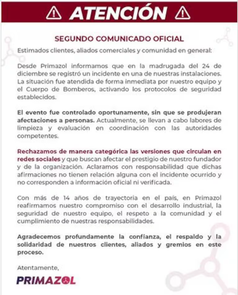 En un inusual pronunciamiento, la empresa Primazol, ubicada en la zona industrial del municipio zuliano de San Francisco, negó las versiones que se propagaron en redes sociales y que vincularon una explosión reportada en la planta con el supuesto ataque estadounidense.