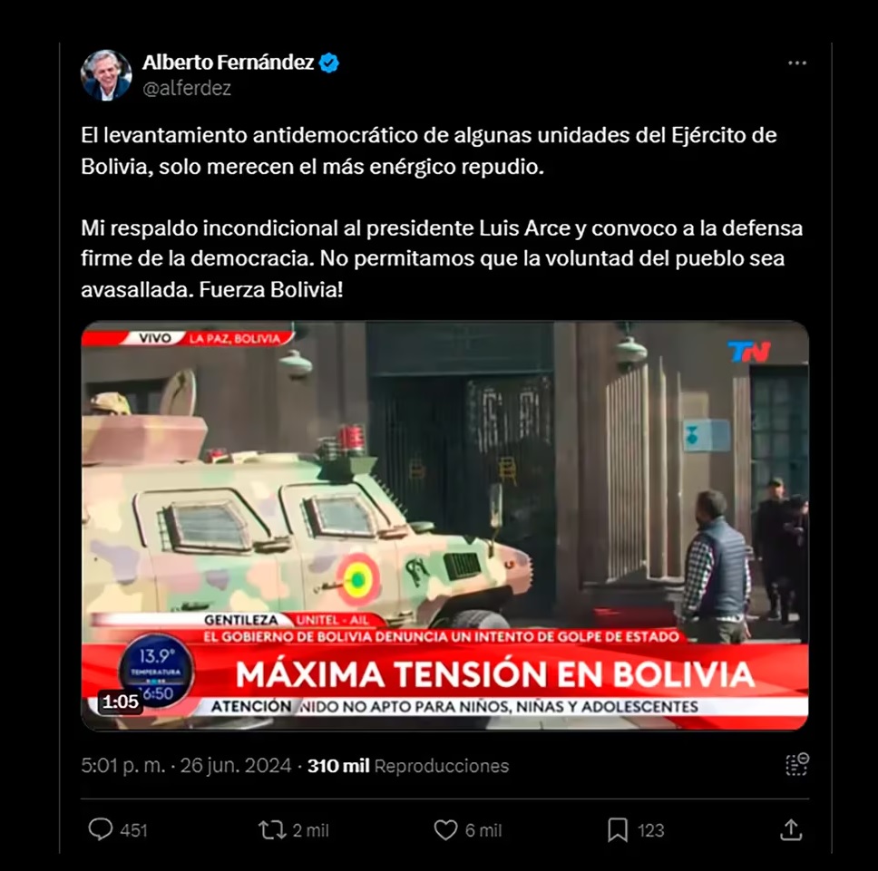 La crisis política que se vive en Bolivia generó una amplia reacción en el arco político argentino, que rechazó el levantamiento de sectores del ejército contra el gobierno de Luis Arce. A través de las redes sociales, el ex presidente Alberto Fernández fue uno de los primeros en manifestar su respaldo a la gestión de Arce, pero no el único. El comité nacional de la Unión Cívica Radical se pronunció en el mismo sentido, al igual que el bloque de diputados de Unión por la Patria en el Congreso de la Nación.
