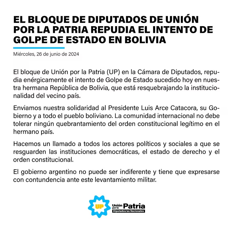 Además, se emitió un comunicado desde el bloque de Diputados de Unión por la Patria (UxP) para “repudiar enérgicamente el intento de golpe de Estado sucedido hoy en nuestra hermana República de Bolivia, que está resquebrajando la institucionalidad del país vecino”.