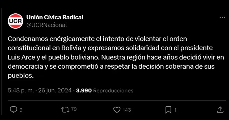 El comité de la UCR, en tanto, afirmó: “Nuestra región hace años decidió vivir en democracia y se comprometió a respetar la decisión soberana de sus pueblos”. En la misma dirección, el PRO también fijó una postura institucional respecto de la situación que atraviesa Bolivia y calificó abiertamente como un intento de golpe de Estado al accionar de integrantes de las fuerzas armadas en el país vecino.