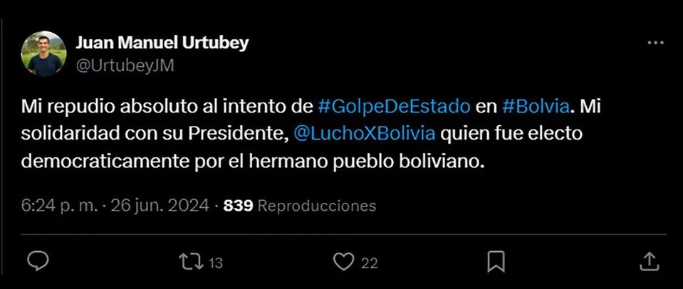 Otro dirigente peronista, como el ex gobernador de Salta, Juan Manuel Urtubey, marcó su postura al respecto: “Mi repudio absoluto al intento de golpe de Estado en Bolivia. Mi solidaridad con su presidente Luis Arce, quien fue electo democráticamente por el hermano pueblo boliviano”.