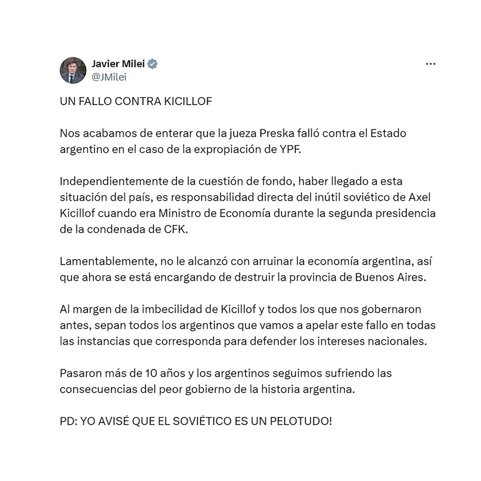 El escenario sobre la cual se va a desarrollar la reunión de esta mañana es particular. El Gobierno recibió ayer un baldazo de agua fría con la noticia que provino de los juzgados neoyorquinos. Aun así, el Presidente informó minutos después de que el Estado argentino apelará la decisión. Deberá ser rápido, ya que Preska dio un plazo de 14 días para entregar el capital accionario de YPF. En ese mensaje, Milei insultó a Axel Kicillof, actual gobernador bonaerense, y este último respondió que “se trata de un disparate jurídico y de una intolerable intromisión sobre nuestra soberanía”.
