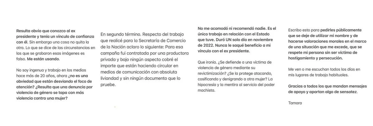 Después de hacerse públicas las imágenes de Tamara Pettinato junto al expresidente Alberto Fernández el pasado lunes por la tarde, la misma emitió un comunicado a través de sus redes sociales donde expresó que se siente utilizada.