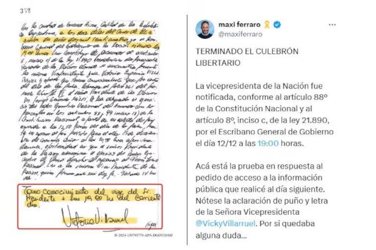 Sobre esta polémica, anoche hubo una novedad. El diputado Maximiliano Ferraro, presidente de la Coalición Cívica, el partido de Elisa Carrió, reveló en X que “la vicepresidenta de la Nación fue notificada, conforme al artículo 88º de la Constitución Nacional y al artículo 8º, inciso c, de la ley 21.890, por el Escribano General de Gobierno el día 12/12 a las 19:00 horas. Acá está la prueba en respuesta al pedido de acceso a la información pública que realicé al día siguiente. Nótese la aclaración de puño y letra de la Señora Vicepresidenta. Por si quedaba alguna duda…”